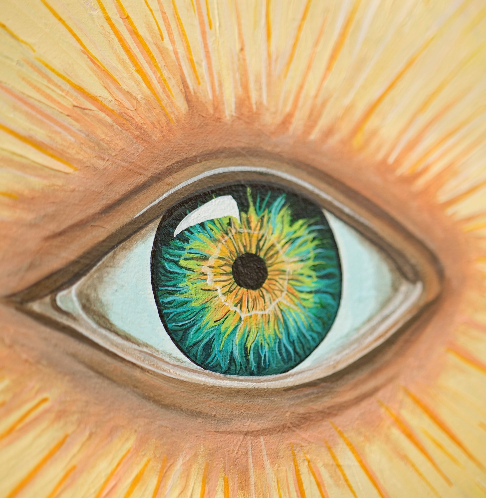 The central eye symbolizes consciousness, the part of us that sees beyond what physically appears to us. The turquoise iris carries the energy of truth and higher awareness, while the golden rays radiate illumination, expansion, and divine light.